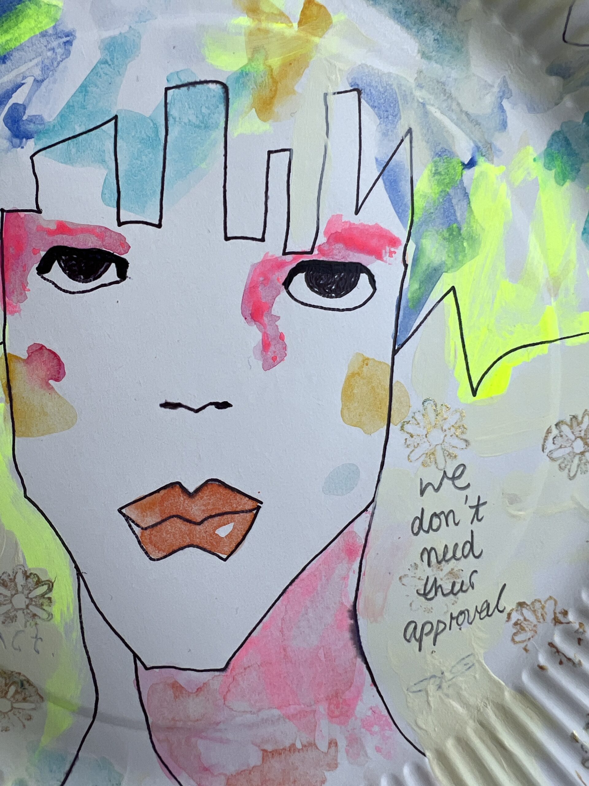A delicate composition emerges on fine paper, drawn with pencil, painted with acrylics and watercolors, and accented with reflective gold elements. Layers of pigment and subtle mark-making create a sense of depth, fragility, and quiet tension.