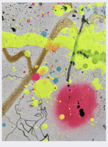 A large, vibrant piece painted directly on the floor, measuring 100 × 80 cm. The composition is bold and colorful, combining expressive strokes and playful forms. It depicts birds that don’t want to fly alongside a female figure — I once met this woman in Paris; she touched me deeply, and I drew her emotional imprint onto a Cake Plates. Graphite sketches are integrated into the painting, adding delicate lines and contrast within the vibrant colors.