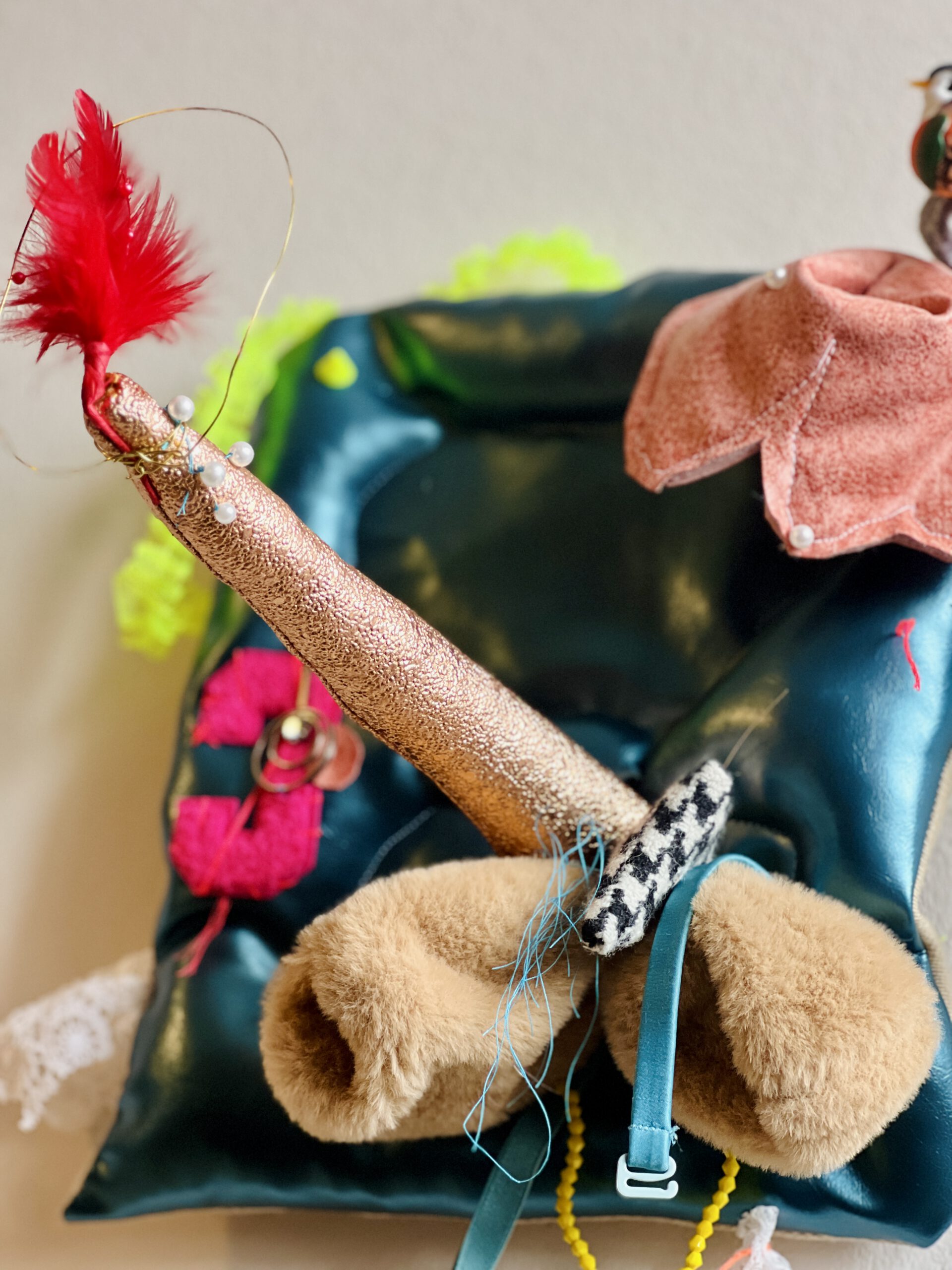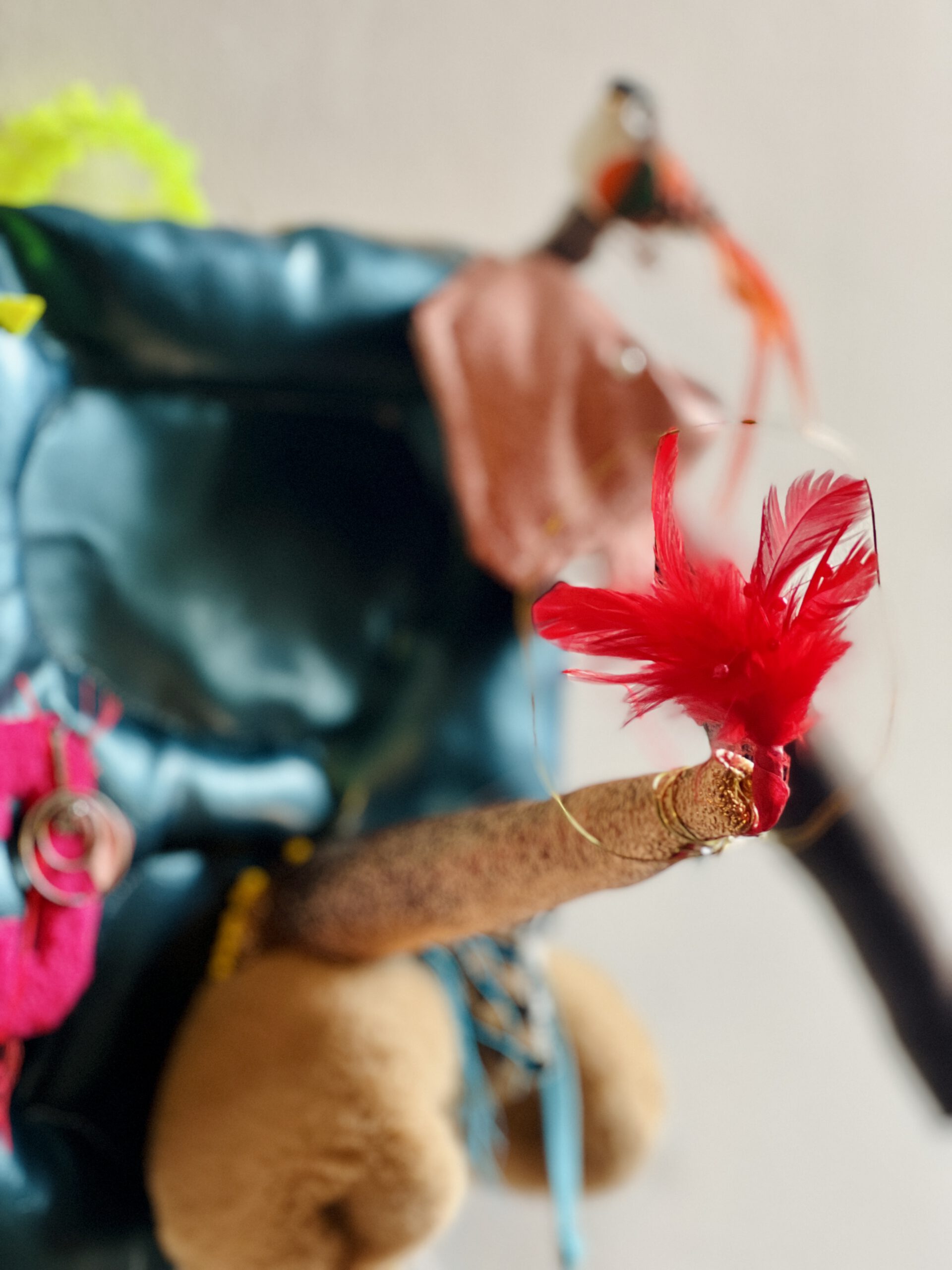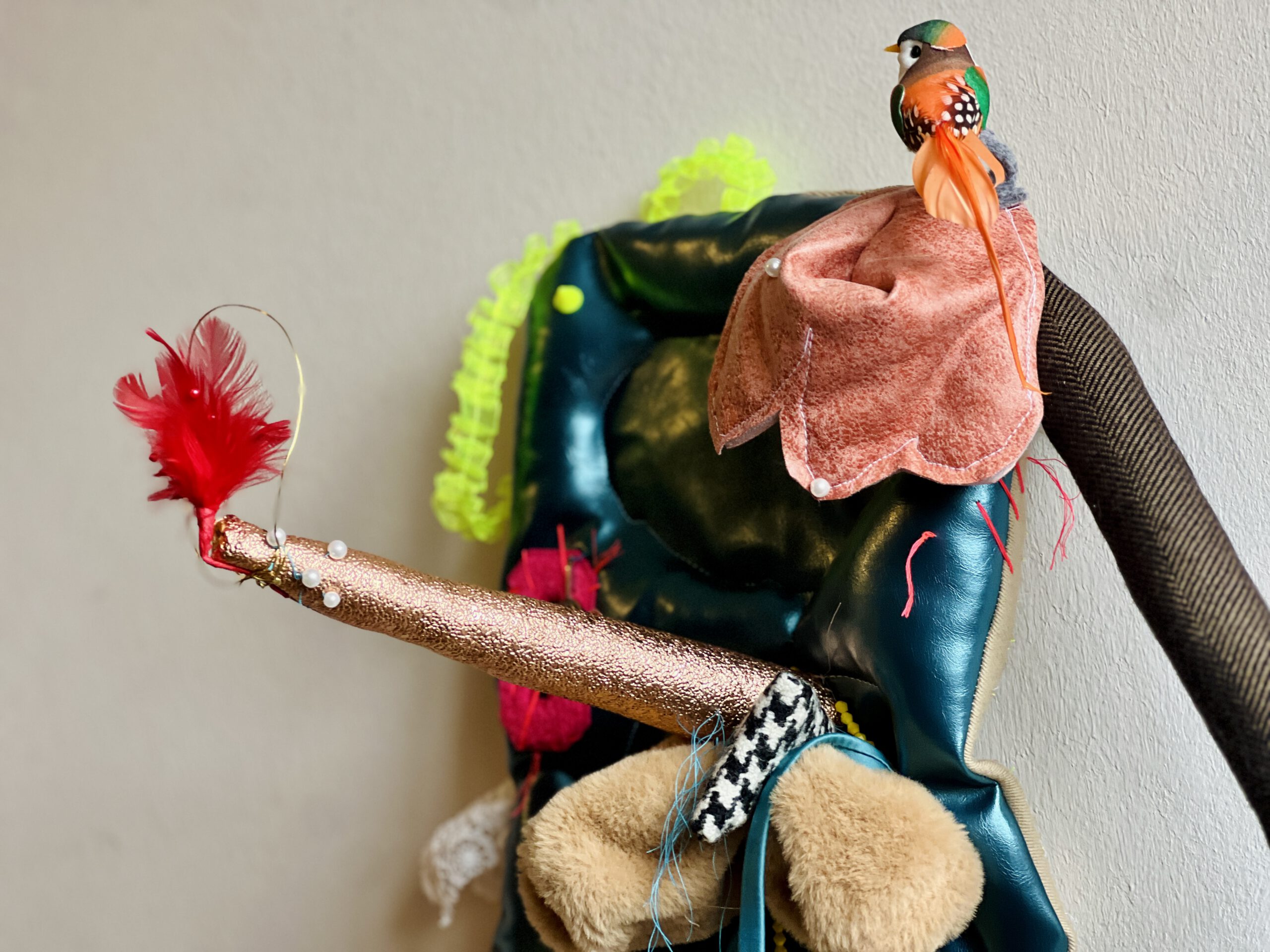 Tactile Contrasts: The inclusion of soft, faux-fur textures alongside sharp, red feathered accents creates a sensory experience that invites the eye to wander.