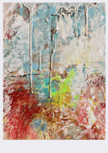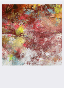 A vibrant piece measuring 100x100cm. The composition is wild and exuberant, made with acrylics, oil paints, oil pastels, and graphite. The work was sprayed, thrown, and painted, capturing a sense of spontaneity, energy, and joyful chaos. The palette is bold and colorful, designed to bring brightness, warmth, and a sense of sunshine to any space.
