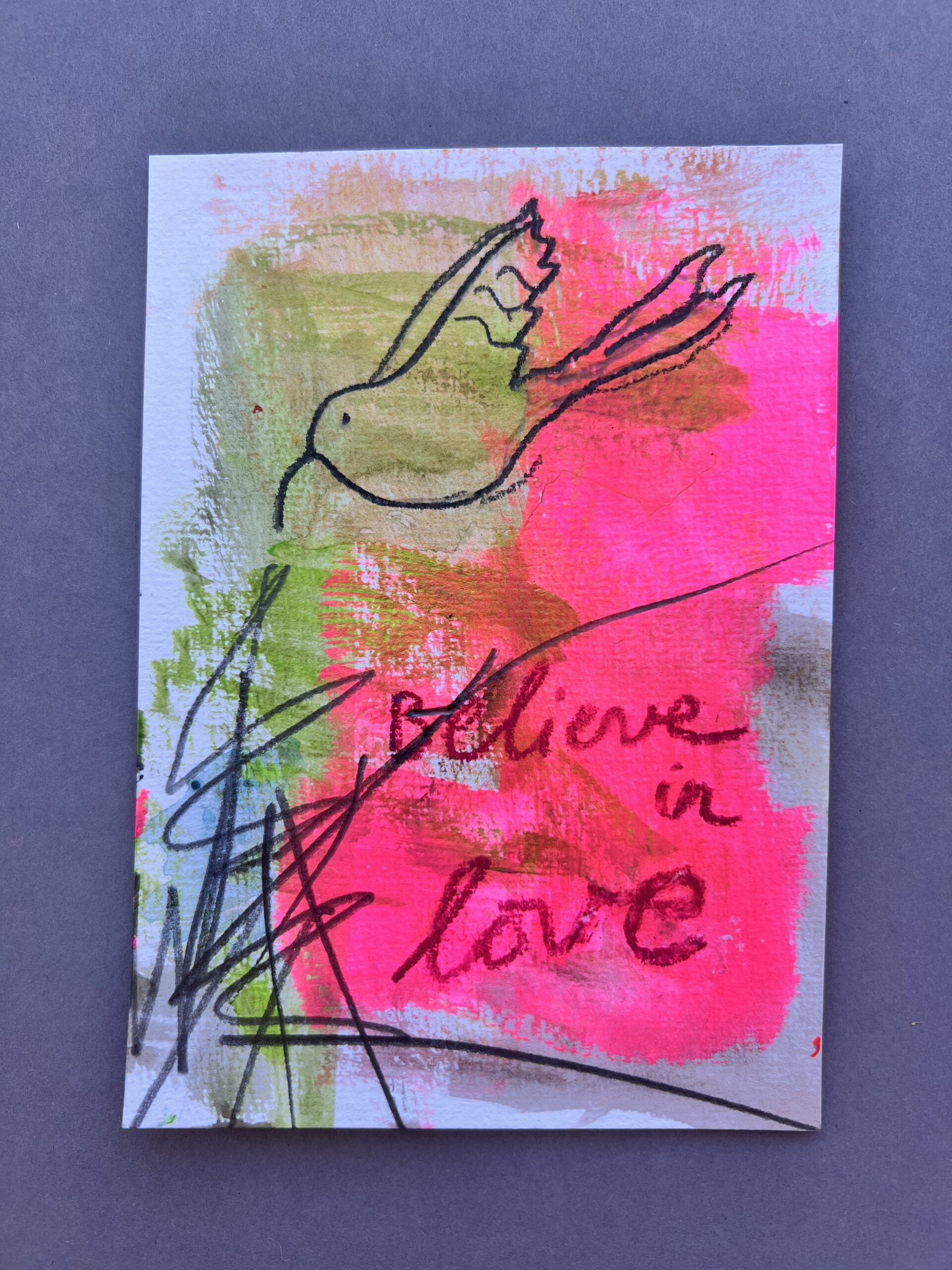 A small, striking piece featuring a cat set against a luminous green background. Wild, energetic graphite strokes surround the figure, creating tension and movement, while the bold text “Fuck Love” asserts itself across the composition. Layers of acrylics and graphite interact dynamically, blending intensity with color to evoke raw emotion and unapologetic expression. The work challenges traditional notions of love and affection, inviting reflection on independence, frustration, and the complexity of human (and animal) emotions.