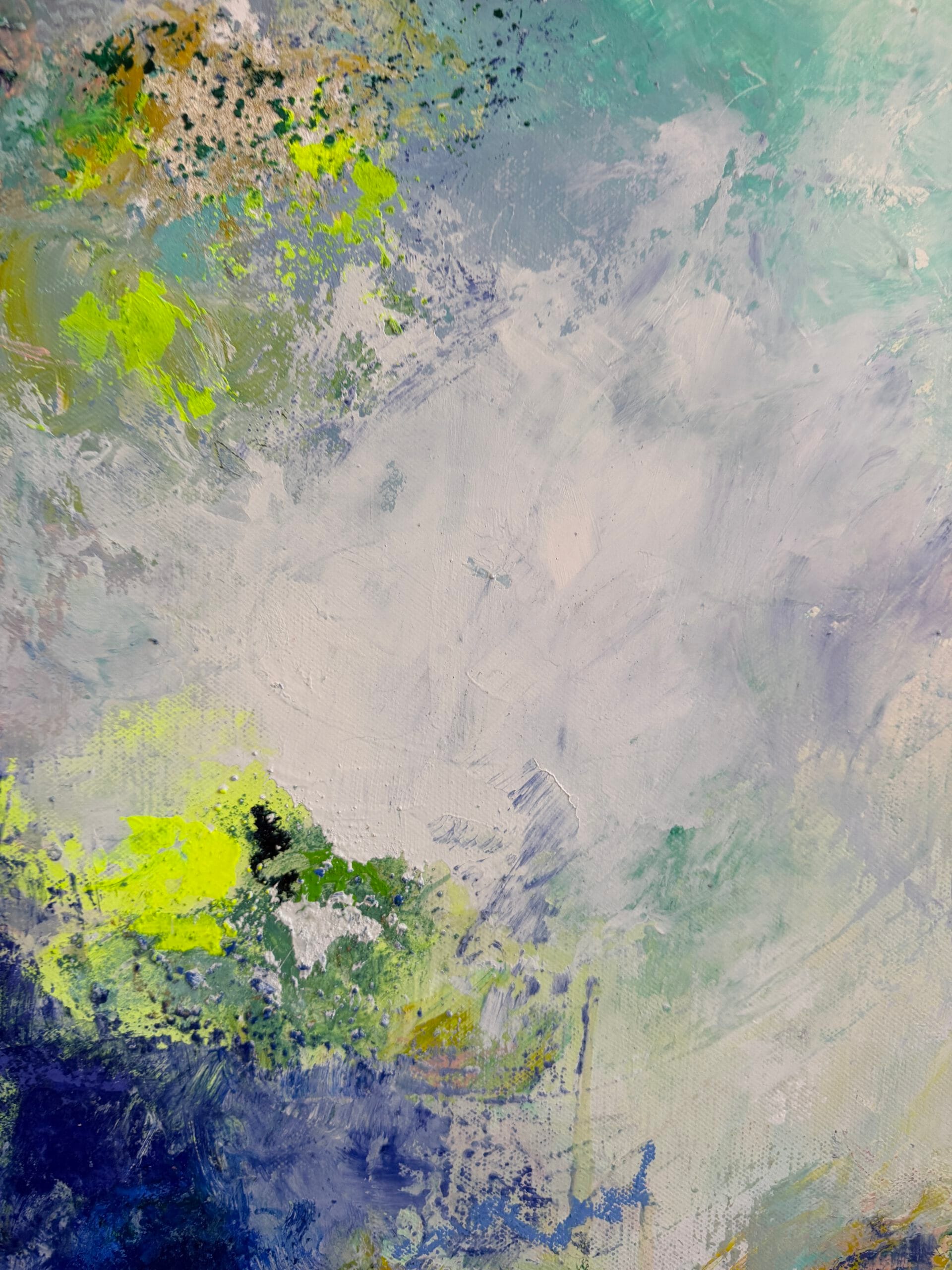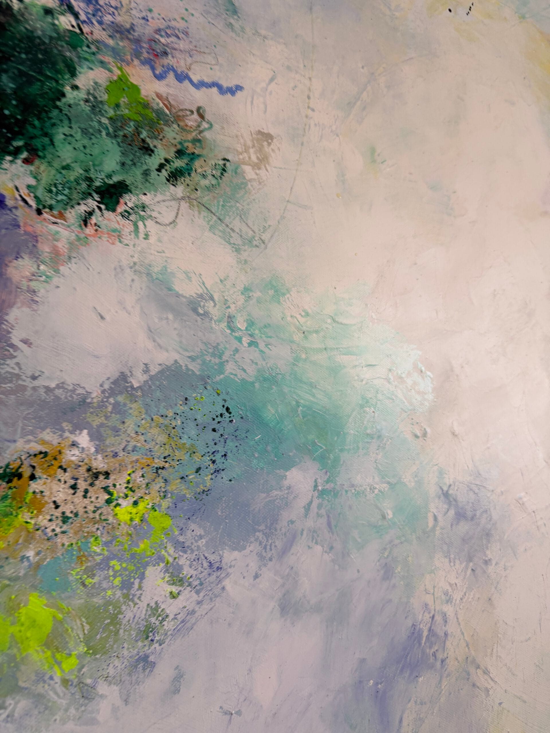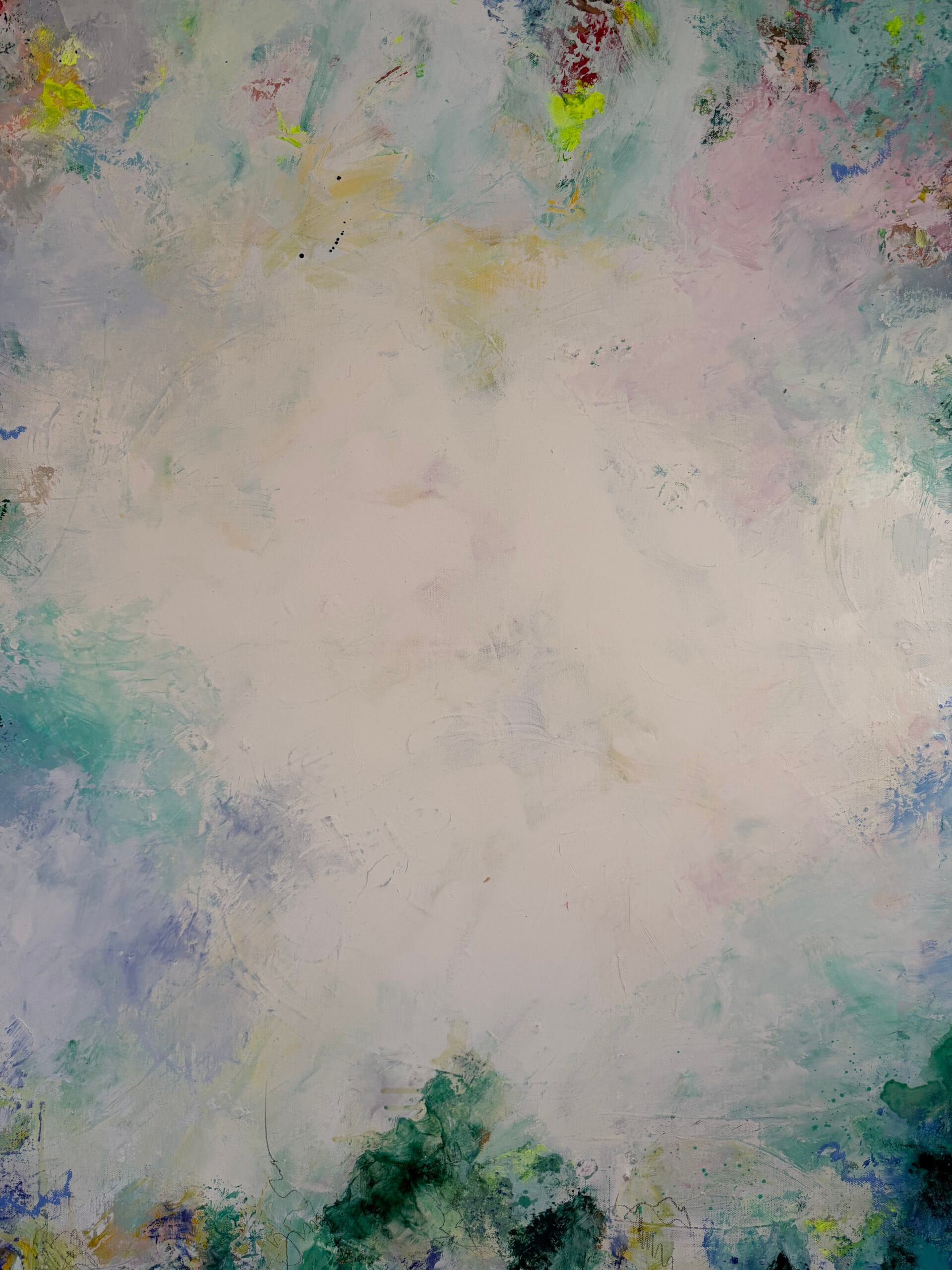 Created through a sophisticated layering process of acrylic and oil, this piece features a radiant, luminous white center that acts as a portal, inviting the viewer to “dive in” and find a moment of stillness. The composition is a vibrant explosion of color, blending the energy of neon sun yellow with deep turquoise green. Soft touches of pink and blue evoke the atmosphere of a distant land where palms sway and the sun shines eternally.