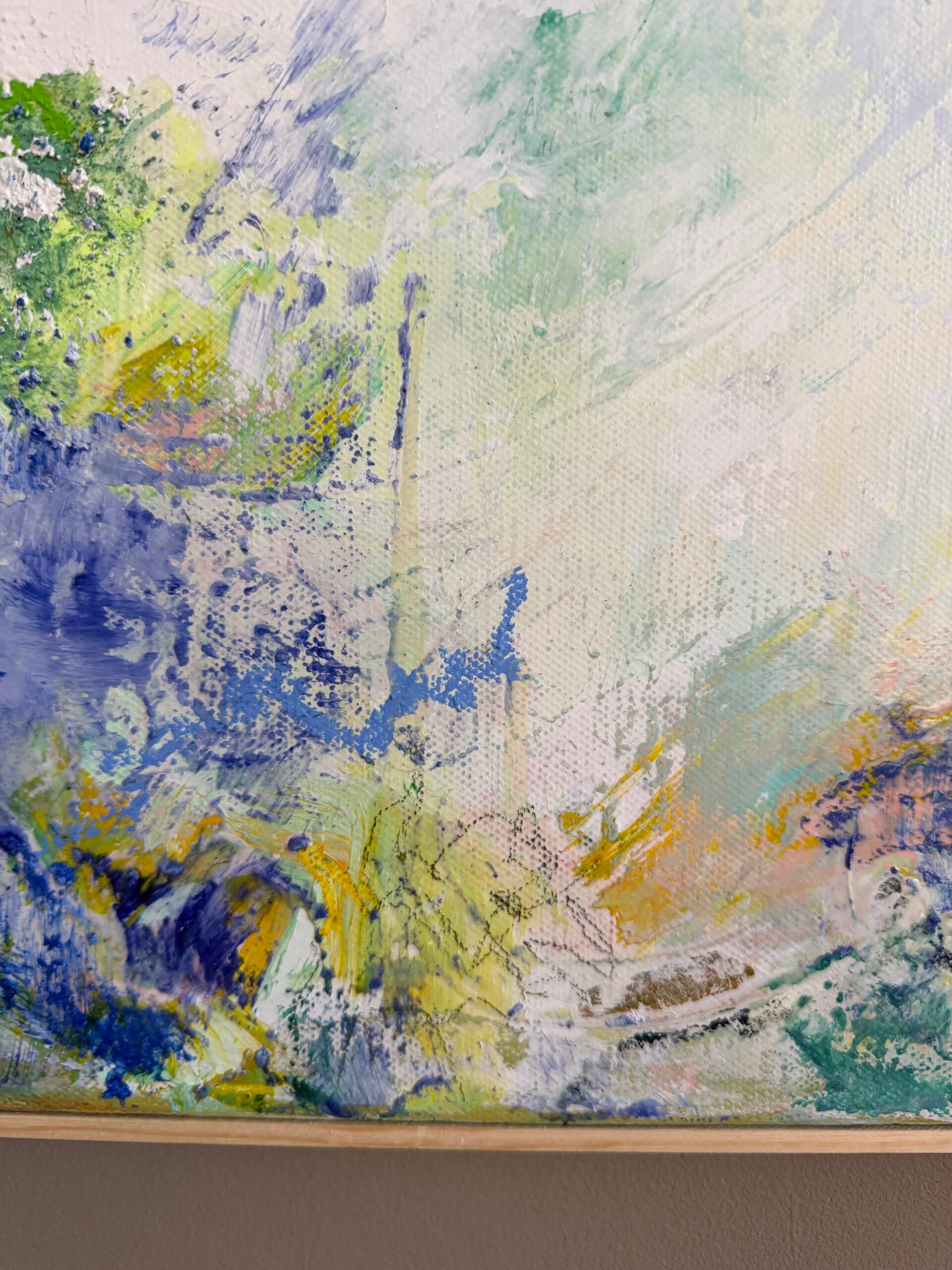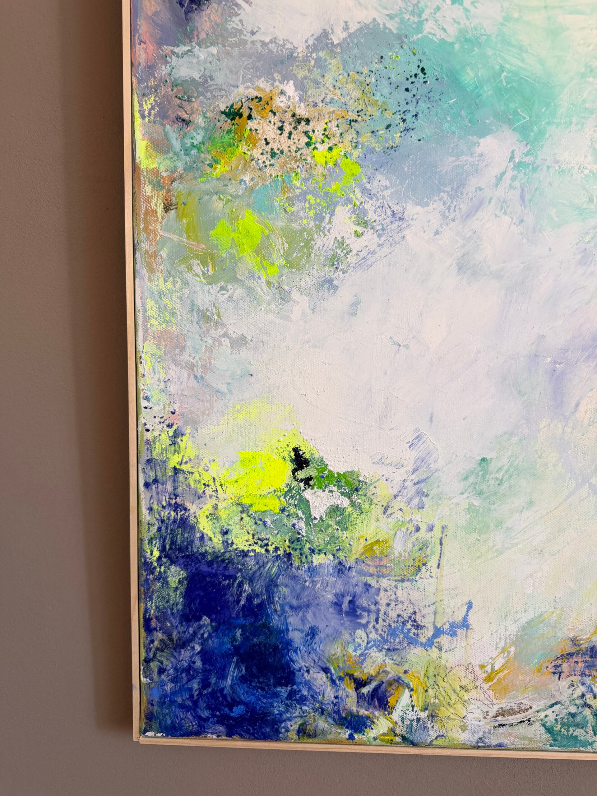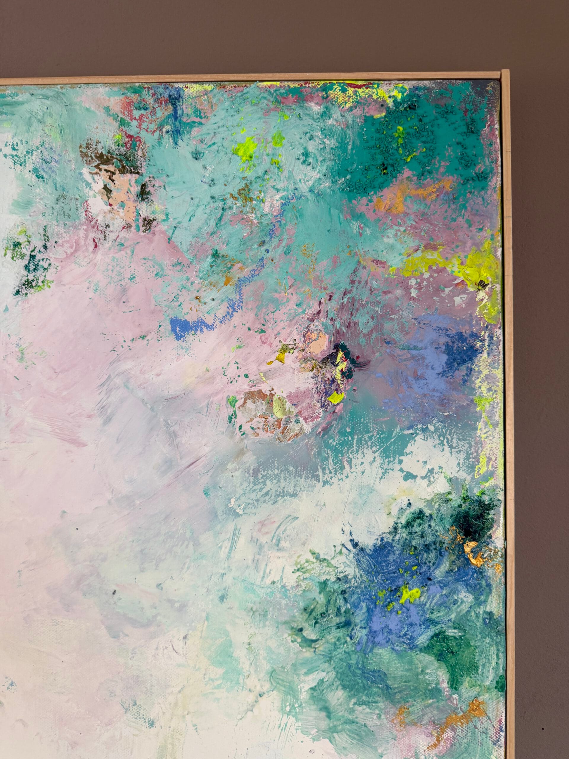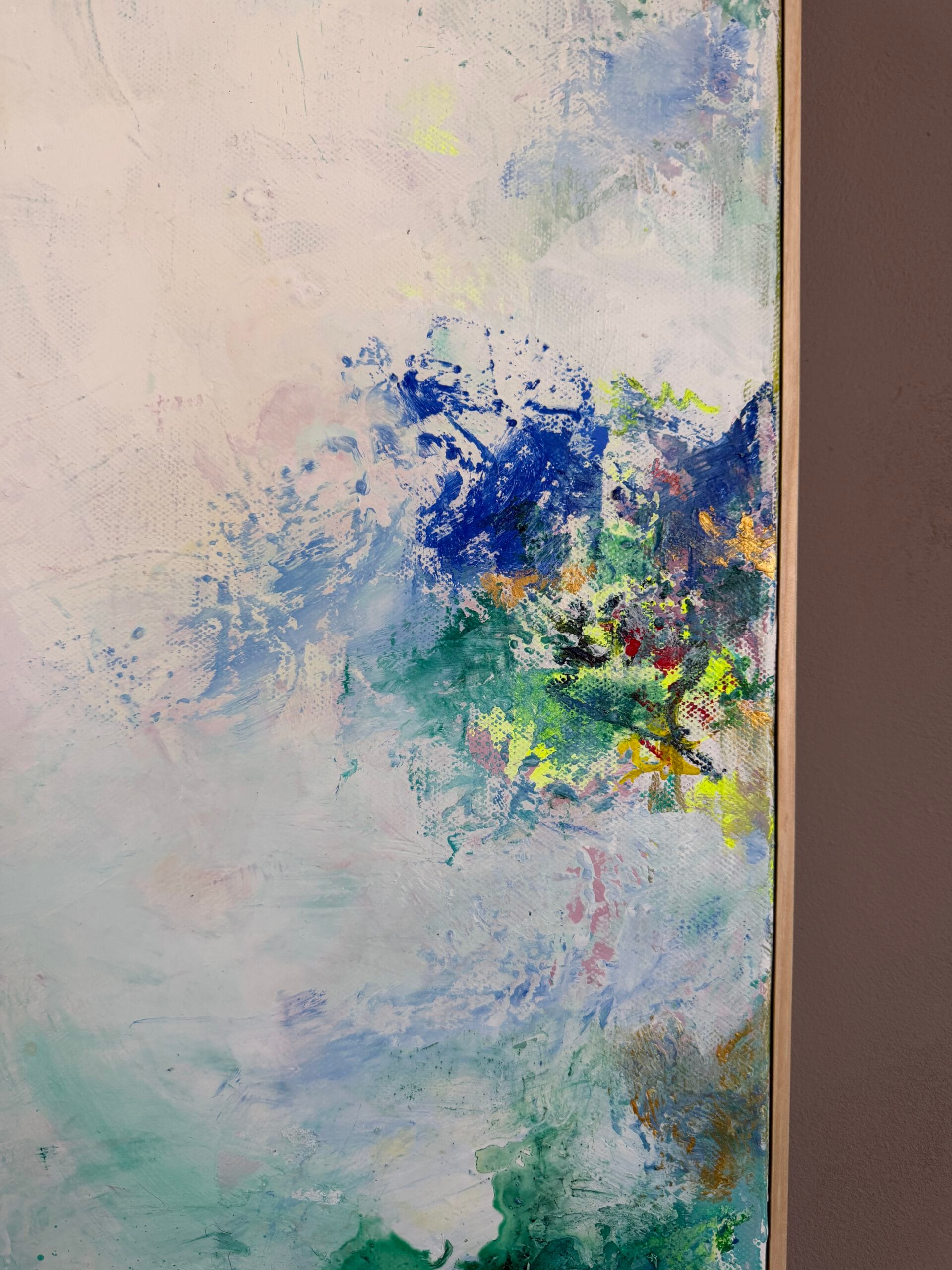Created through a sophisticated layering process of acrylic and oil, this piece features a radiant, luminous white center that acts as a portal, inviting the viewer to “dive in” and find a moment of stillness. The composition is a vibrant explosion of color, blending the energy of neon sun yellow with deep turquoise green. Soft touches of pink and blue evoke the atmosphere of a distant land where palms sway and the sun shines eternally.