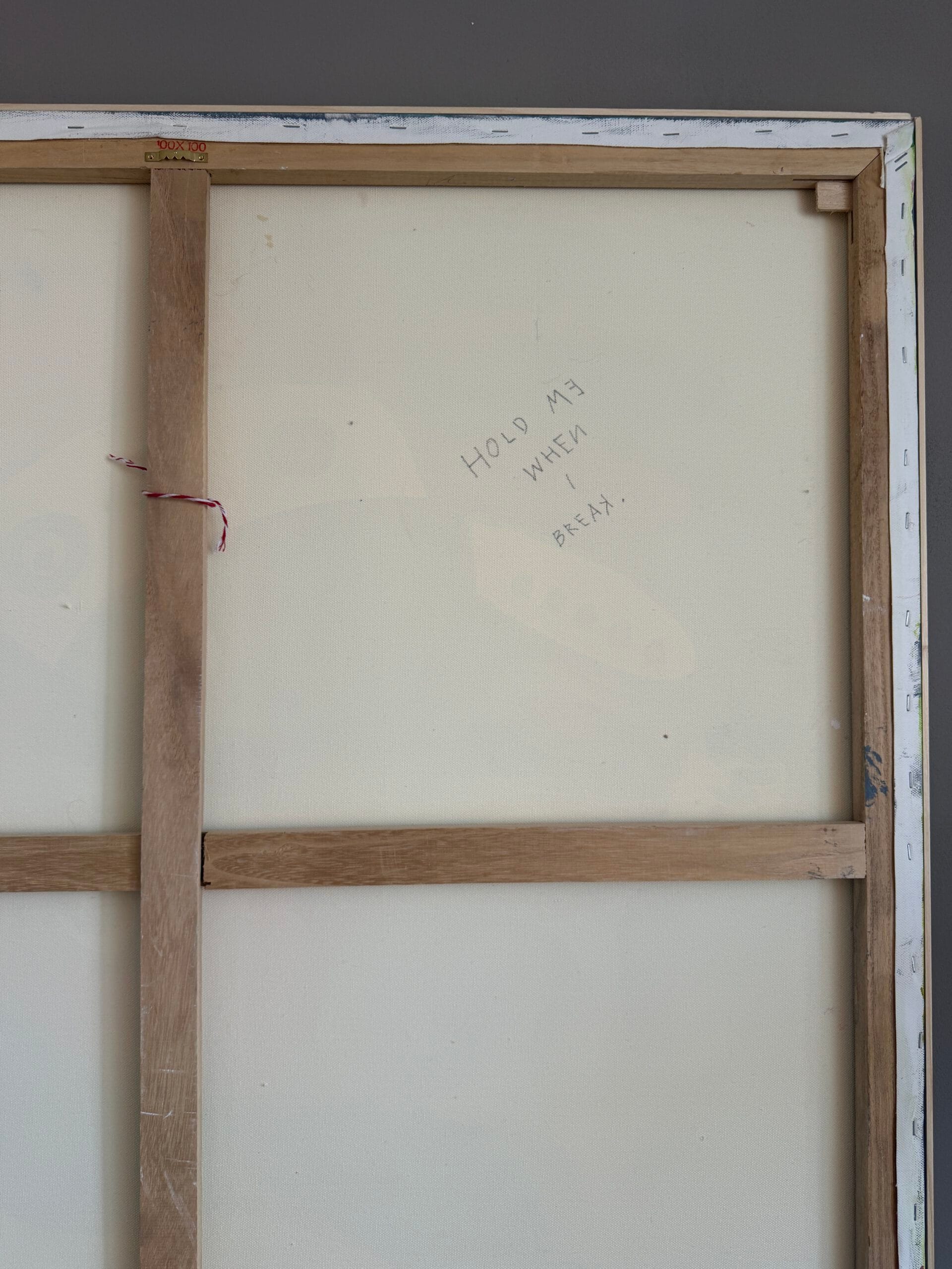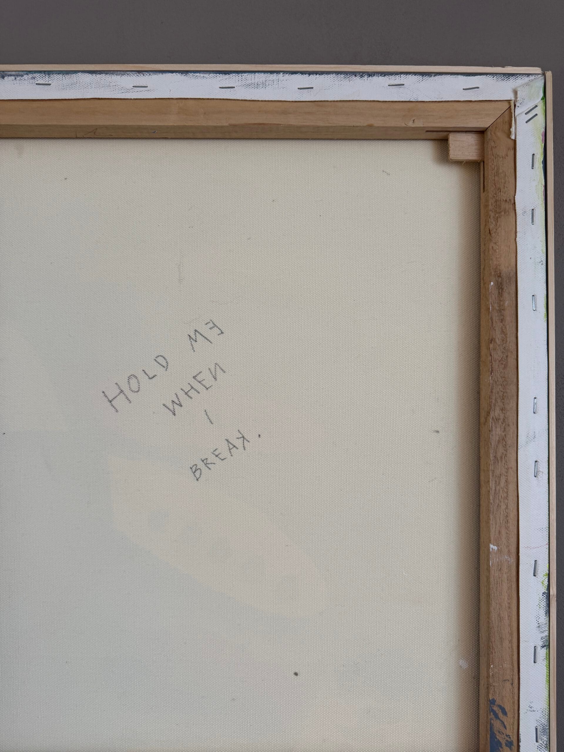 The surface holds a delicate secret: subtle protector beings are sketched in graphite, emerging from the layers like silent guardians. On the reverse side, the work carries the original Cocoletter titled “HOLD ME WHEN I BREAK,” a hidden message that transforms the canvas into a profound meditation on vulnerability and strength.