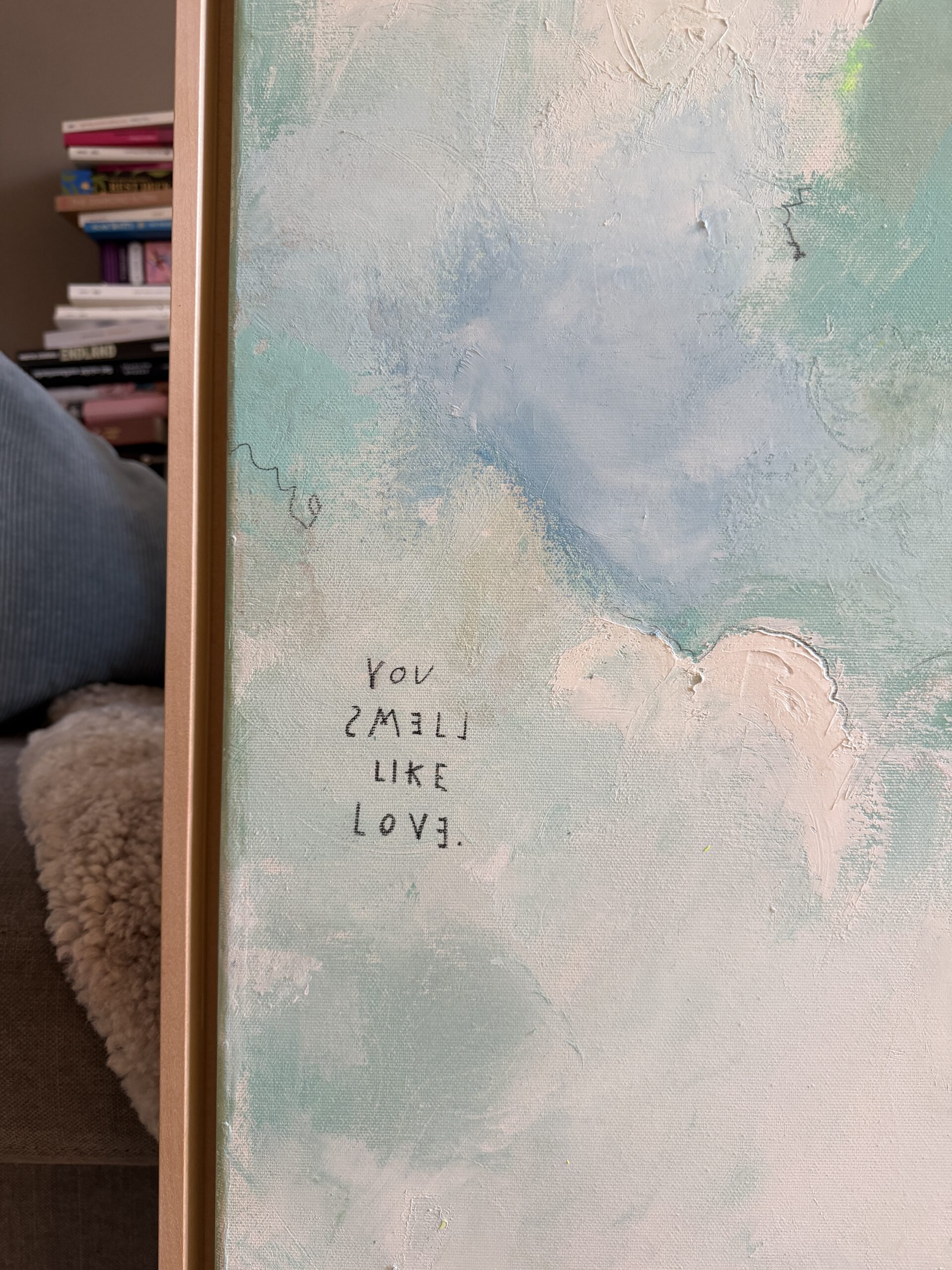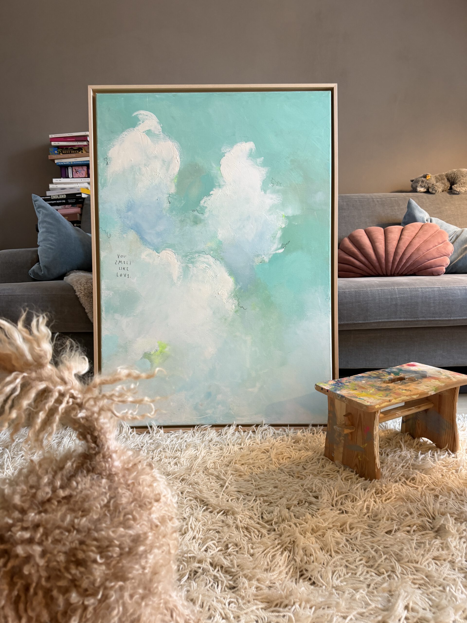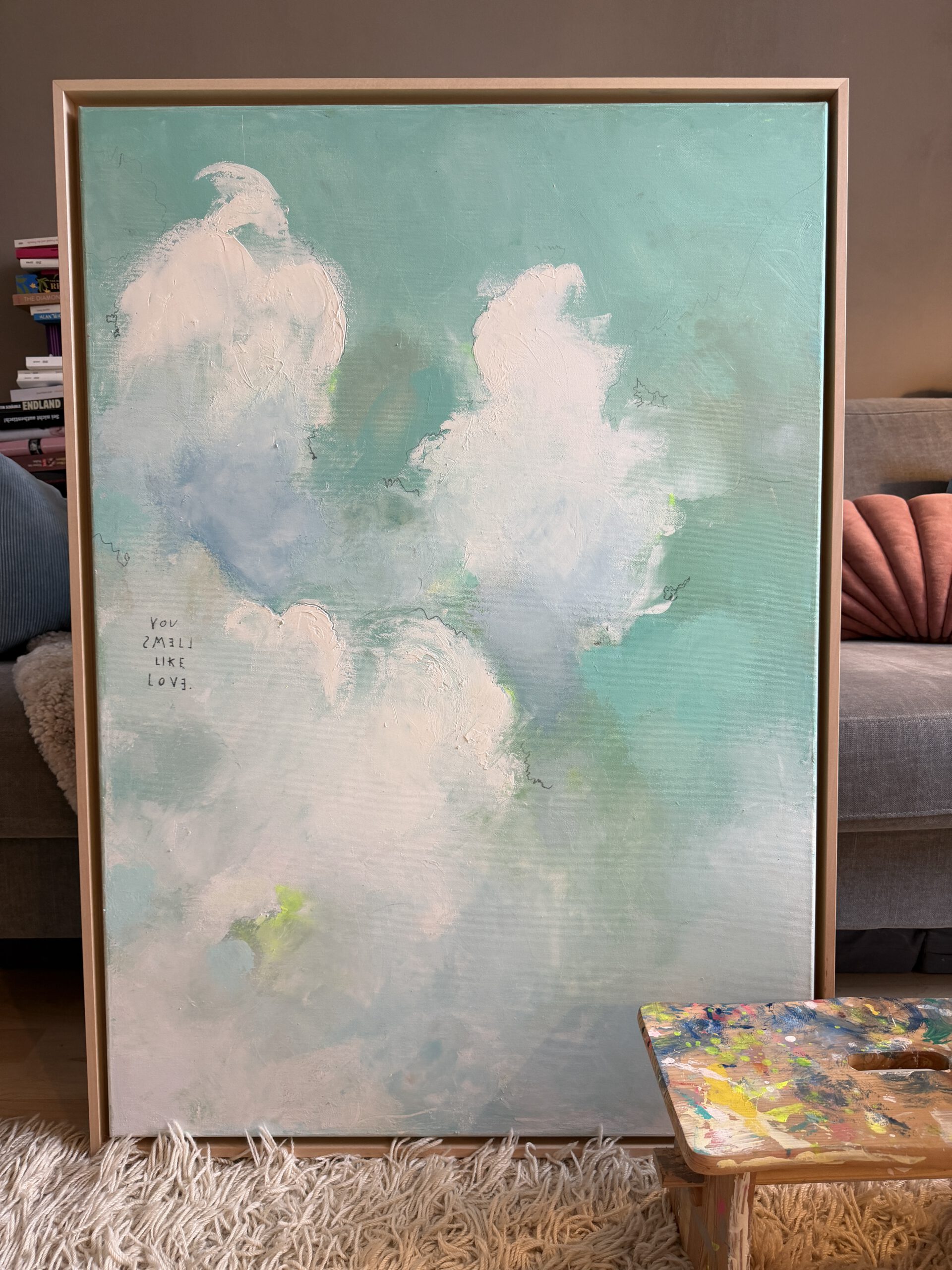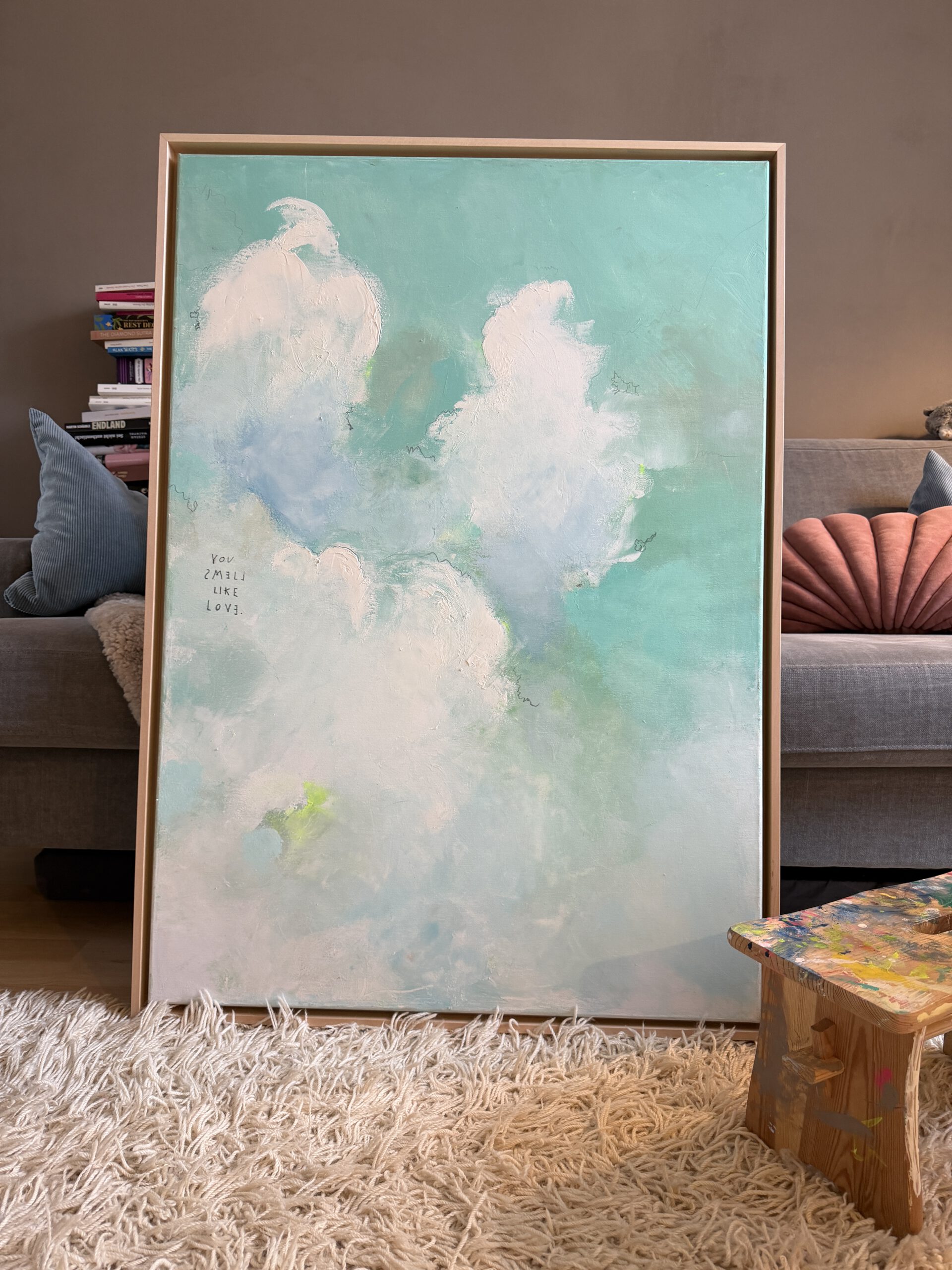 A vibrant, playful piece measuring 100 × 70 cm. The title YOU SMELL LIKE LOVE is legibly inscribed on the front lower-left corner. Two dreamlike creatures inhabit the composition — children may even spot a unicorn — bringing a sense of wonder and whimsy. The color palette is fresh and tropical, reminiscent of my time in the tropics, where turquoise meets soft vanilla yellow and ivory.