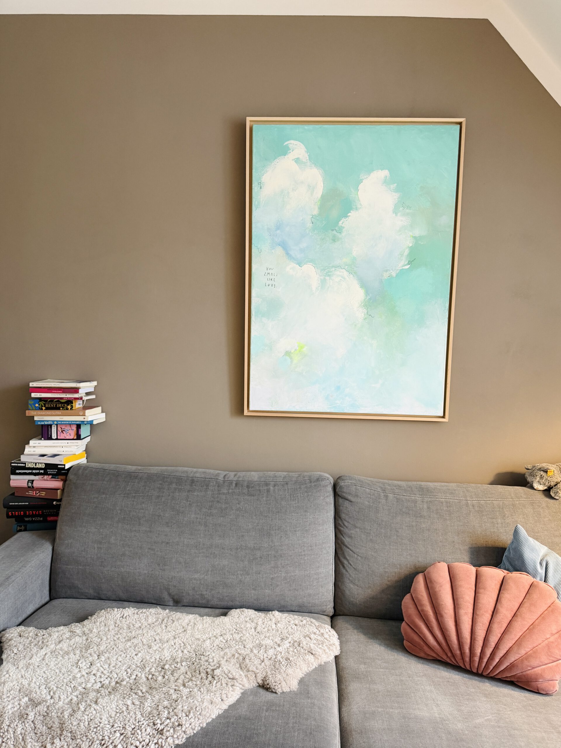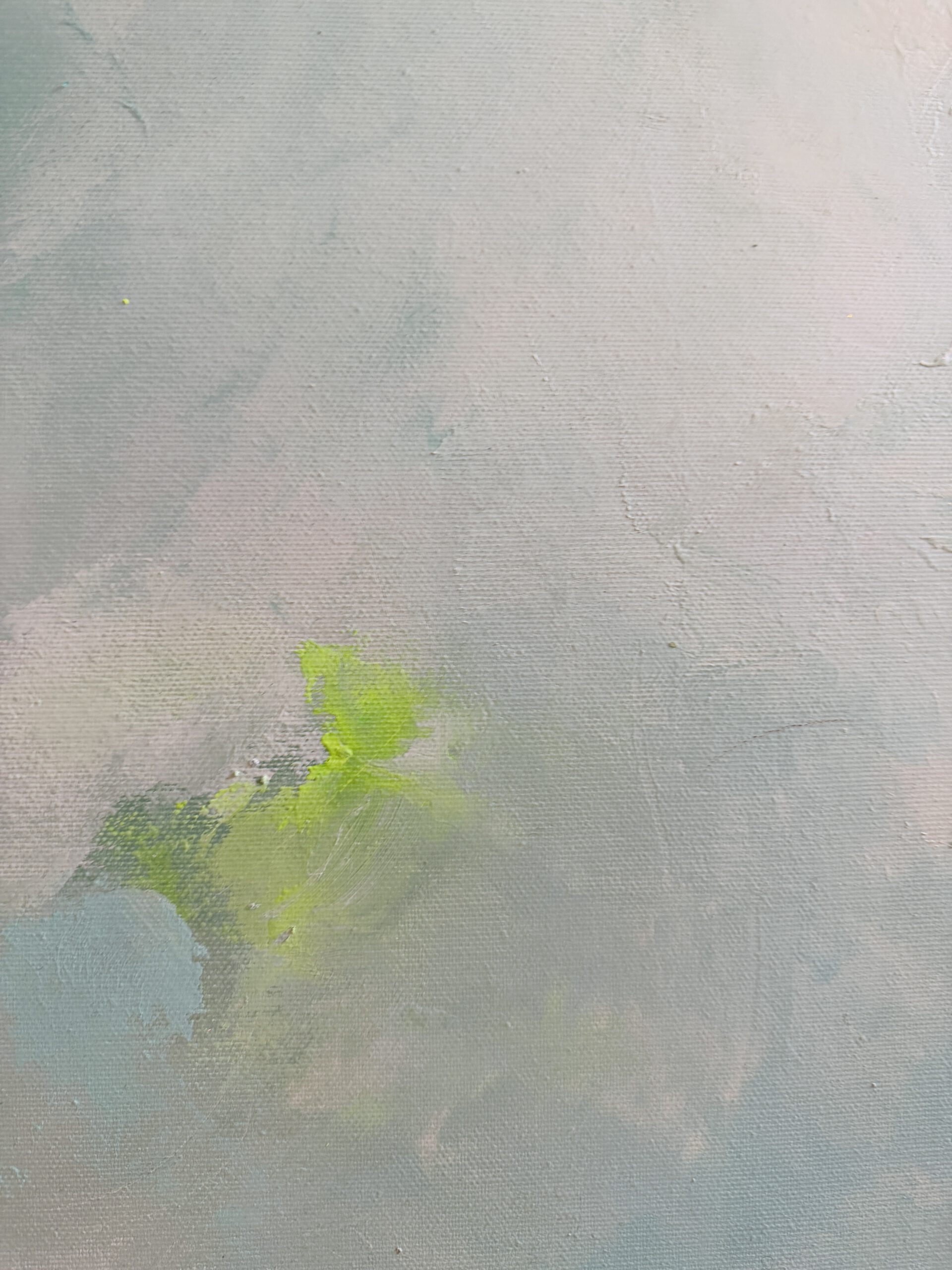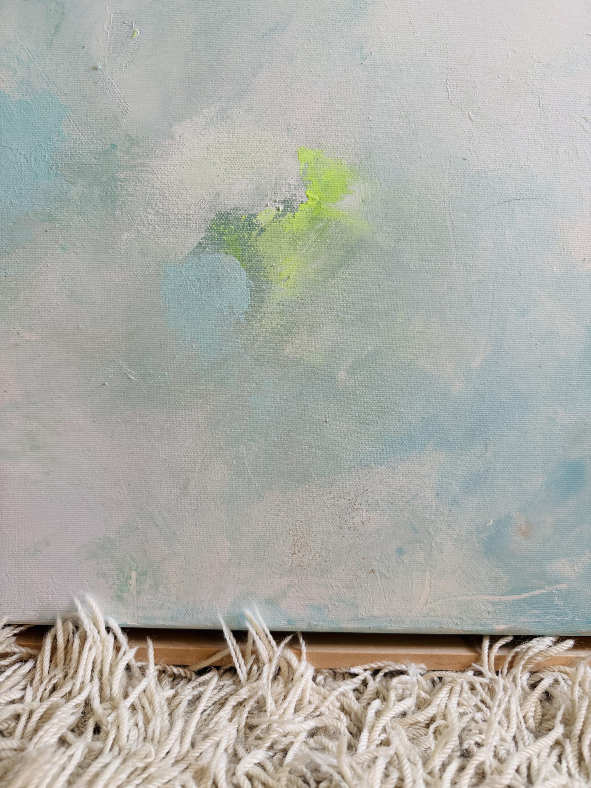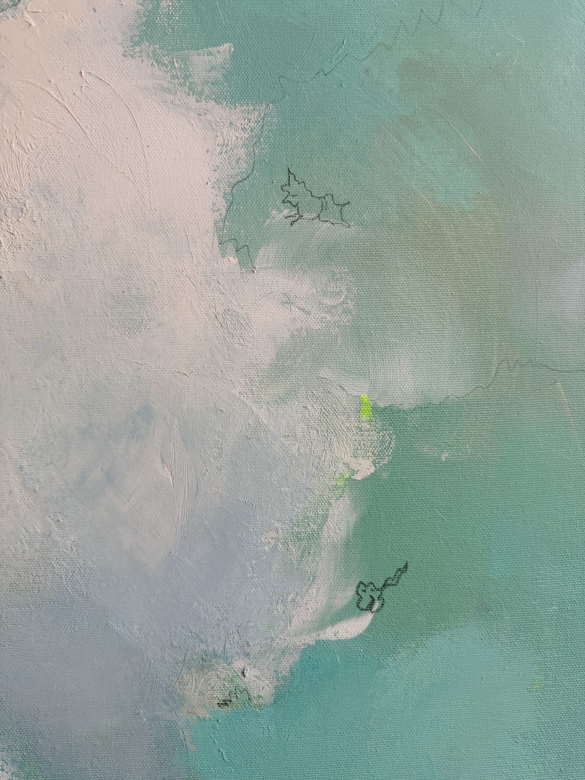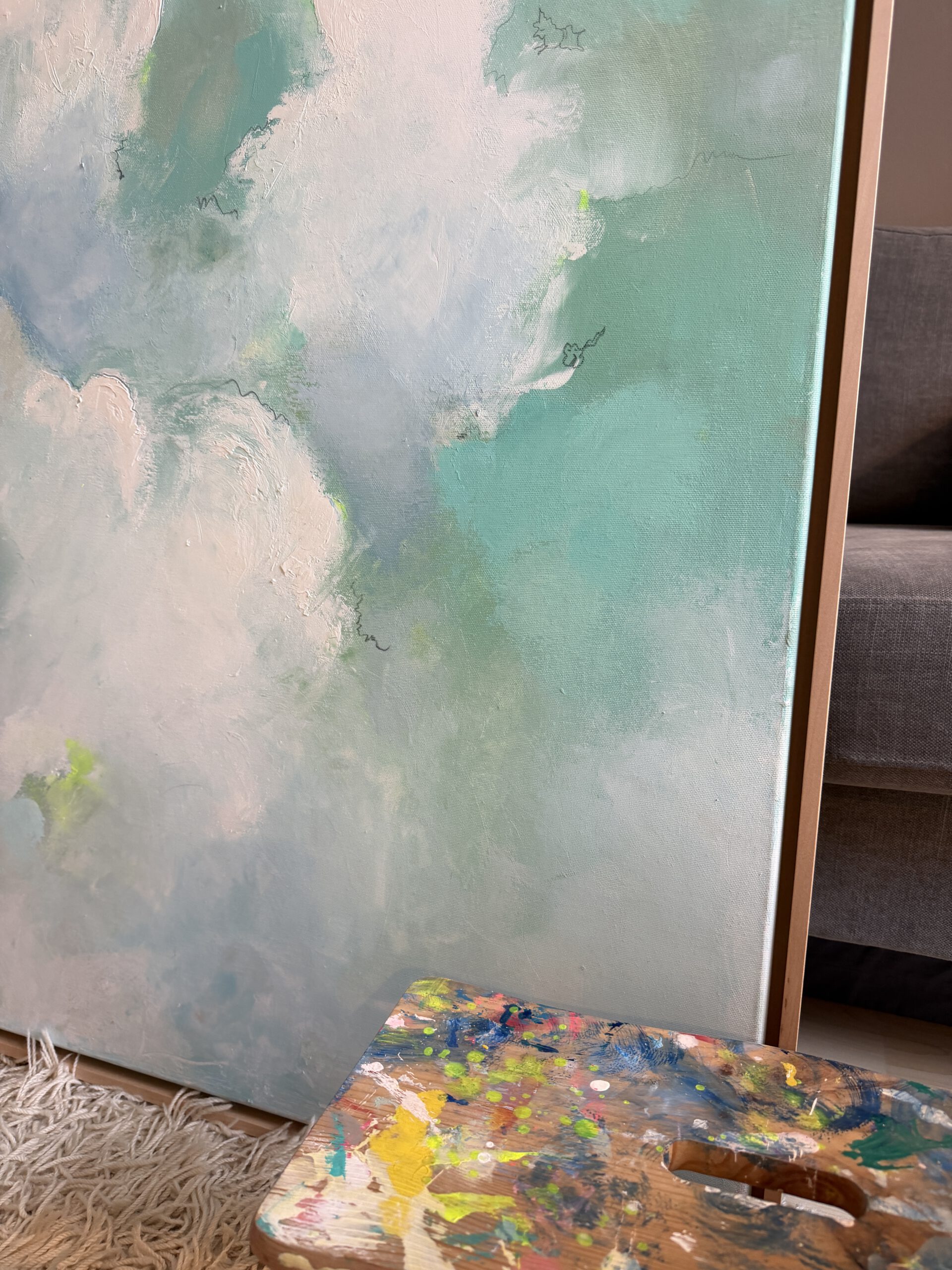 A vibrant, playful piece measuring 100 × 70 cm. The title YOU SMELL LIKE LOVE is legibly inscribed on the front lower-left corner. Two dreamlike creatures inhabit the composition — children may even spot a unicorn — bringing a sense of wonder and whimsy. The color palette is fresh and tropical, reminiscent of my time in the tropics, where turquoise meets soft vanilla yellow and ivory.