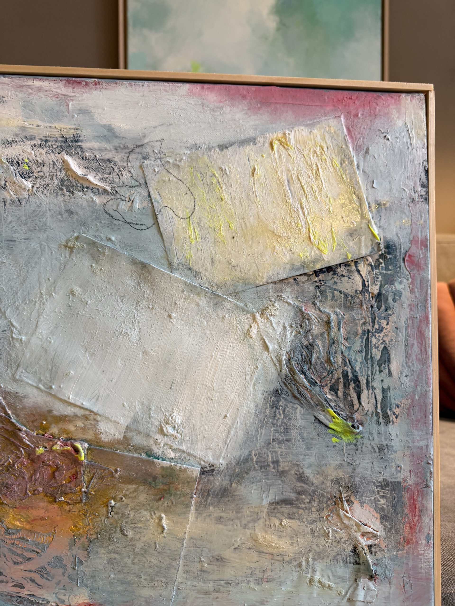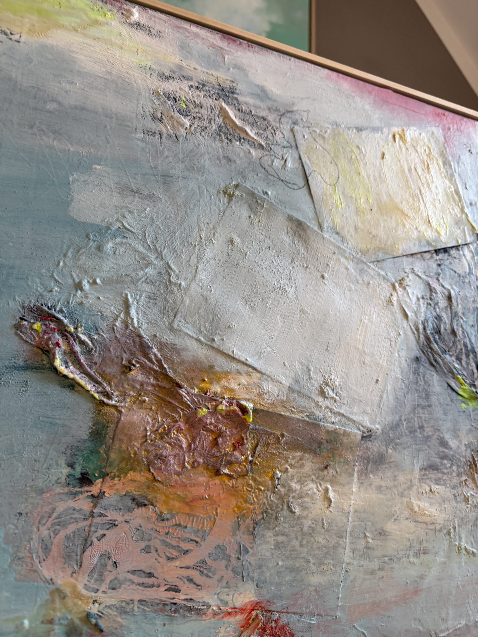A deeply personal and extraordinary painting measuring 80 × 80 cm. The work unfolds as a three-dimensional composition, created through the incorporation of original love postcards received more than a quarter of a century ago in Paris from a person who remains profoundly important to the artist to this day. These embedded fragments carry memory, intimacy, and lived emotion, giving the piece its layered emotional resonance.
